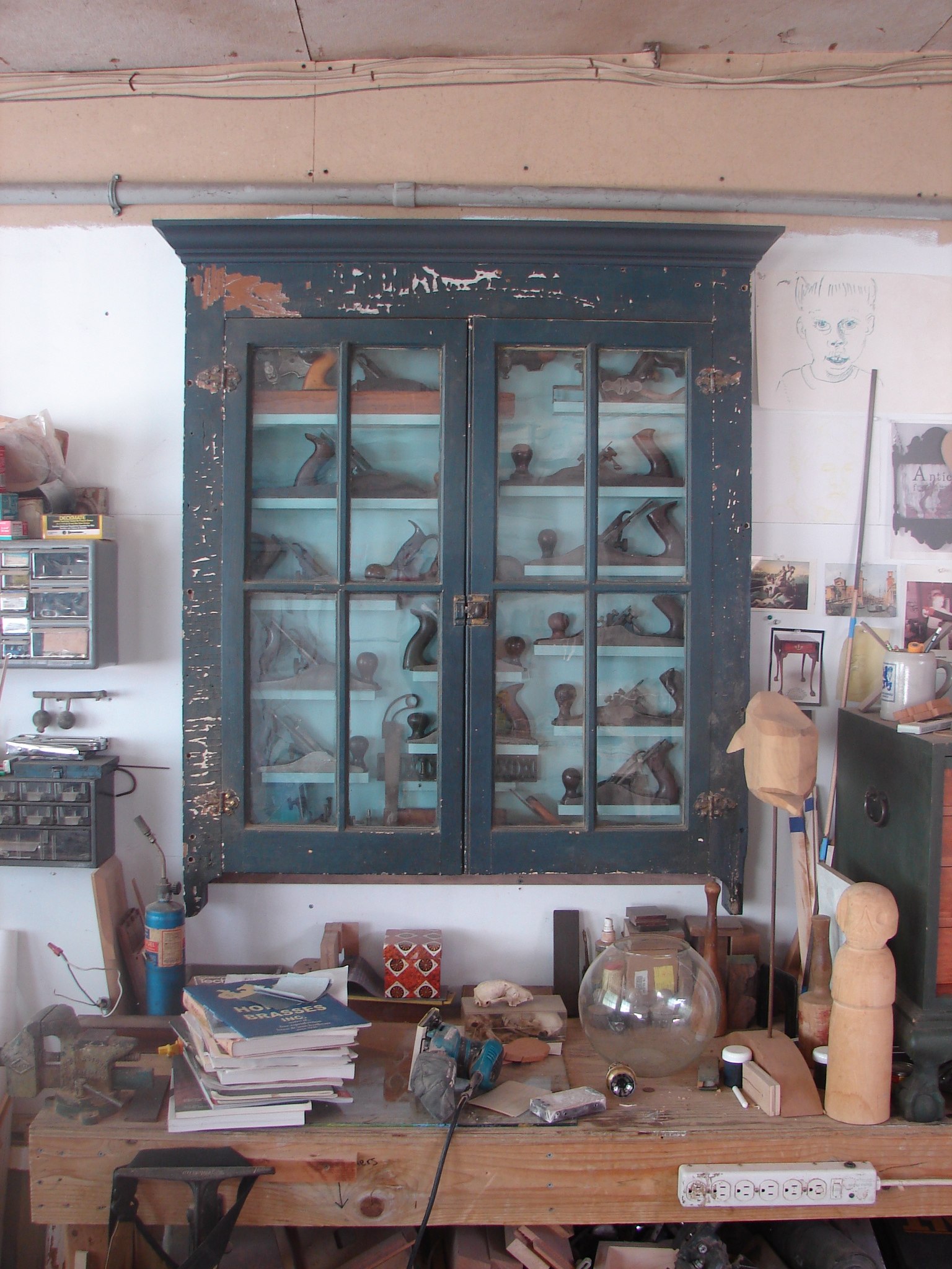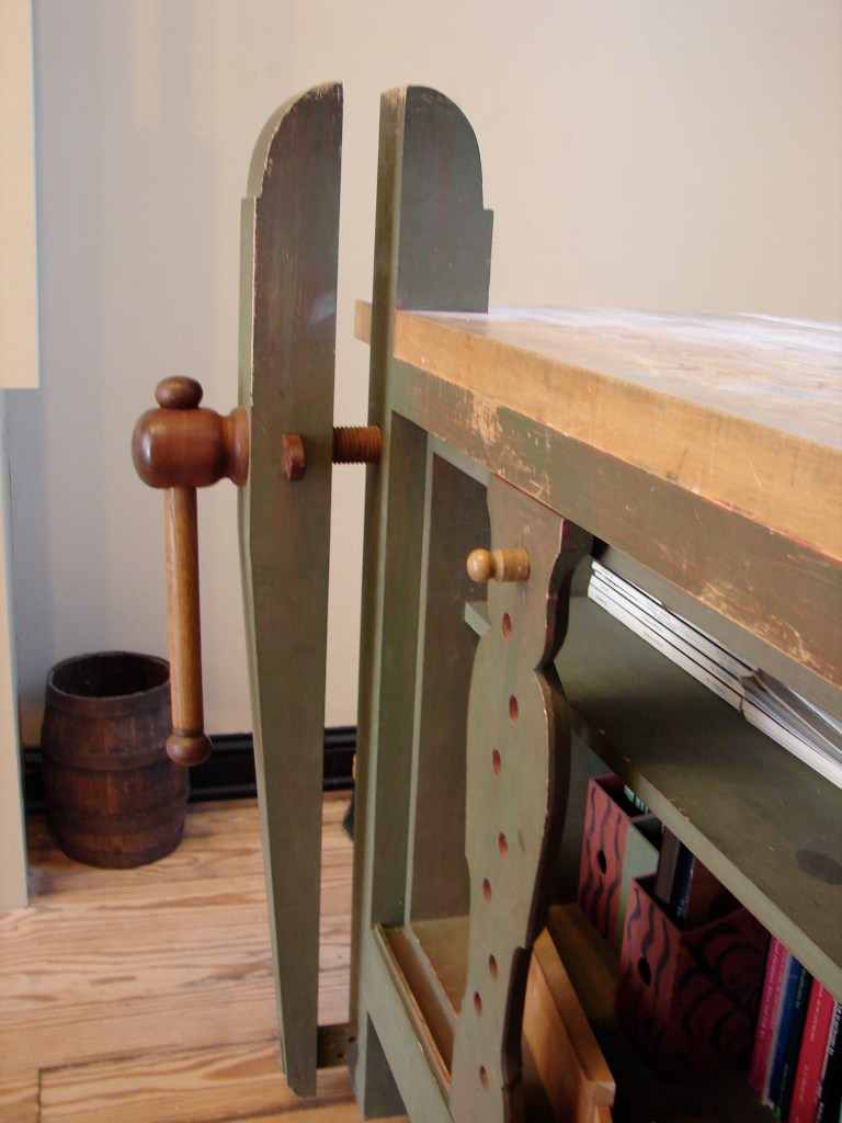 The vise is based on an 18th Century French design I saw in a book. It’s unusual to have the vise projecting above the top, but it works well for shaping legs or other parts where you need to be able to get around without stopping to turn the piece. The plank with the peg and holes in it next to the vise is called the “dead man” [maybe because of the holes]. It is a support for doors or boards that are held in the vise, and it slides on a track in the rail. It is shaped like a chair splat from a set of New York Queen Anne chairs I made.