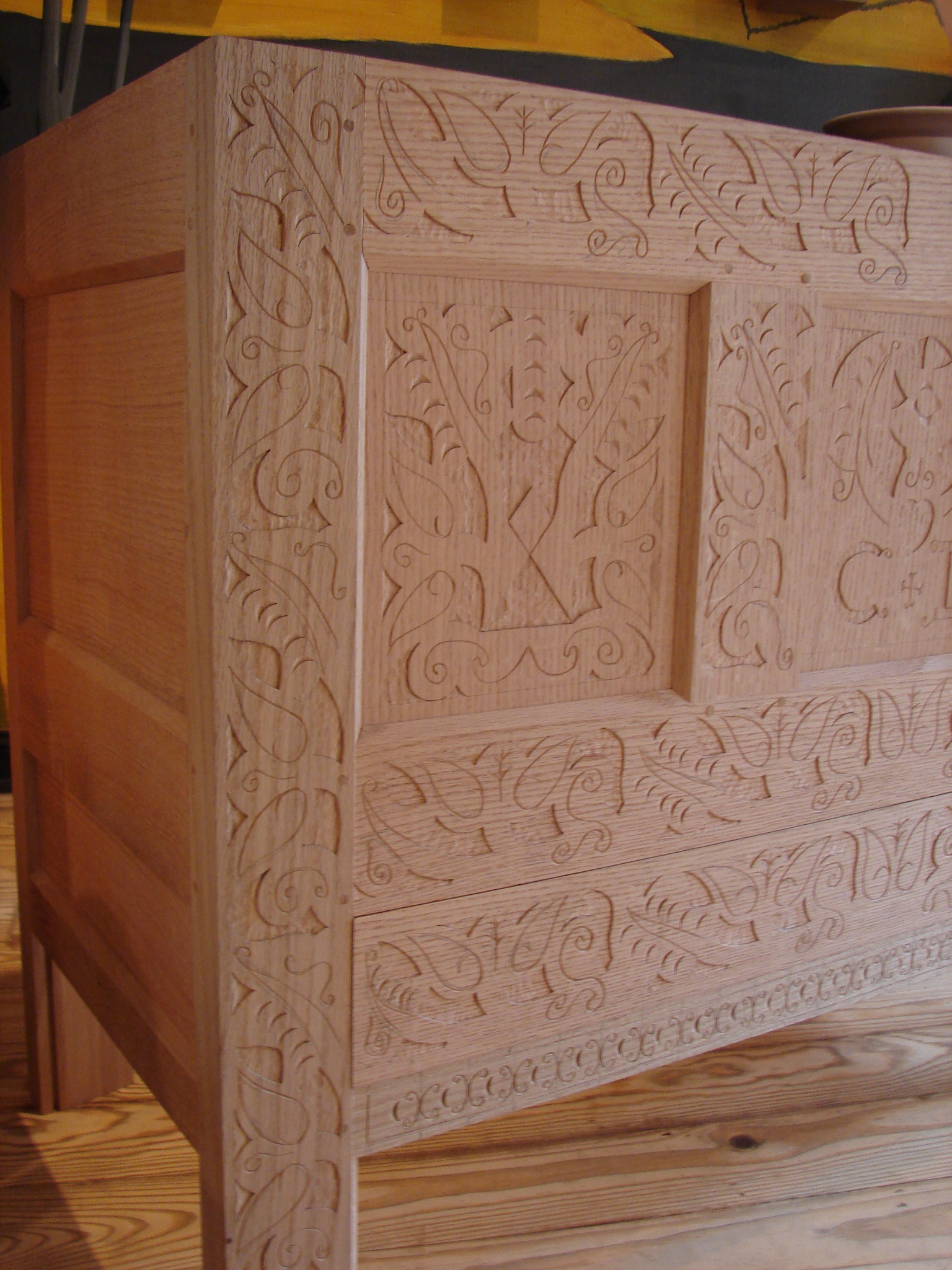 The carving on these chests is of highly stylized, and abstracted, leaves flowers and vines, using a flat chip carved technique. You can see in the first picture how the pattern is repeated and flipped again and again. It was fun to do. It makes me think of Celtic stone carving. On top of the chest is a bible box made of sassafras carved with a similar tulip-vine pattern. A raking light really shows it off.