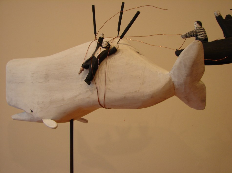 When I get the time and inclination something like this happens. Here is Moby Dick and Ahab, carved from a 16/4 chunk of poplar and painted with milk paint. What is it exactly? A toy, a weathervane, I don’t know, but it was inspired by both.