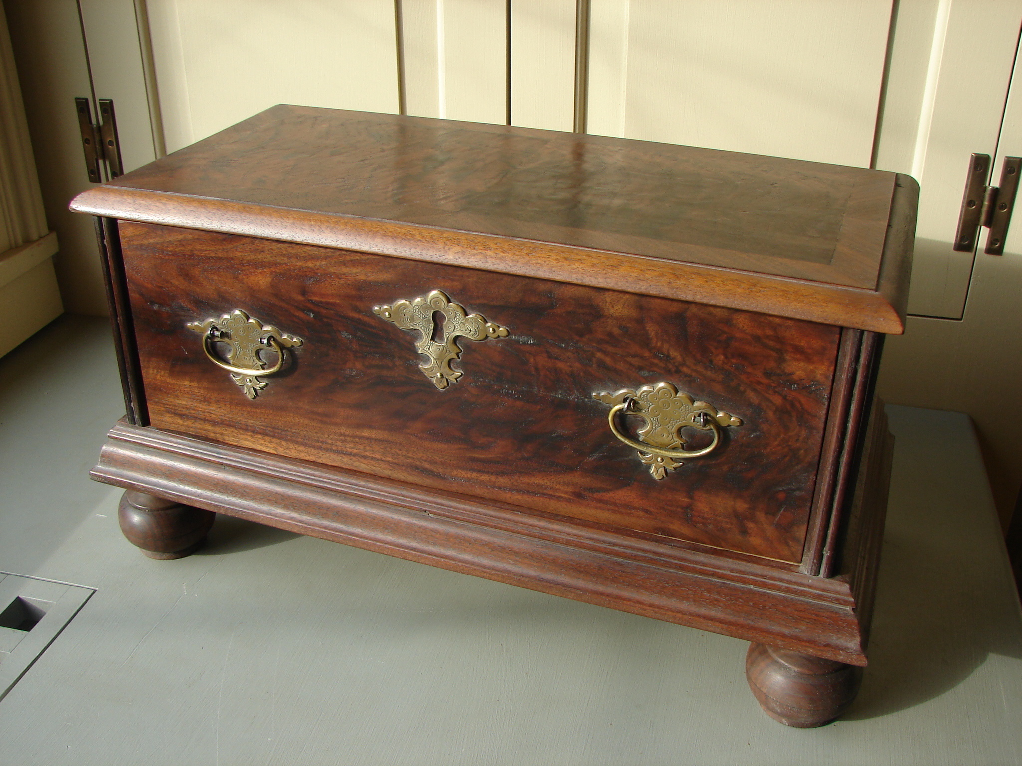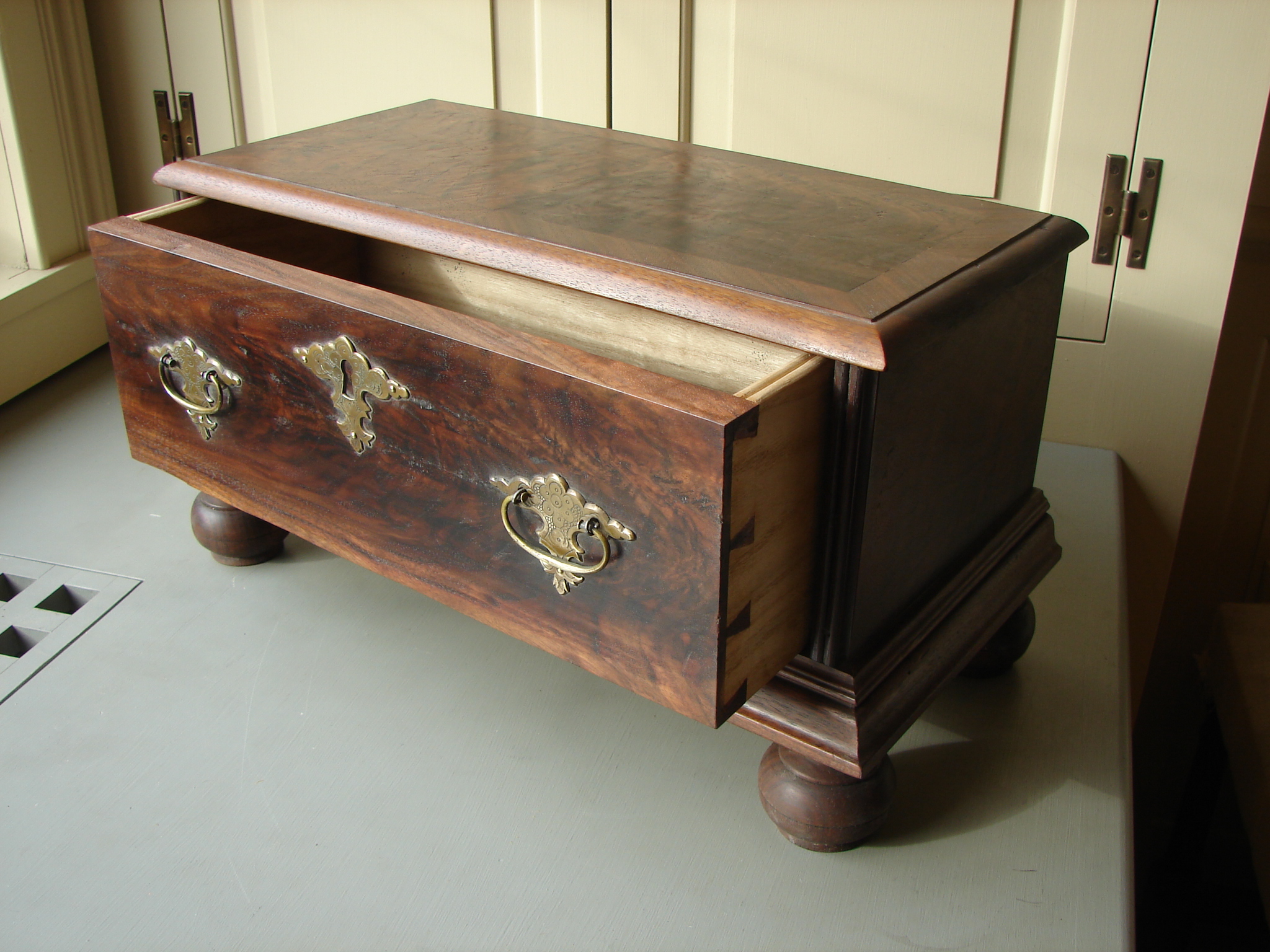 So here we have a box that is nailed together with a dovetailed drawer inside. The top is covered with walnut crotch veneer and edged with walnut cross banding. The drawer front and sides are solid, highly figured walnut. The drawer sides are made of sassafras, a local aromatic hardwood.