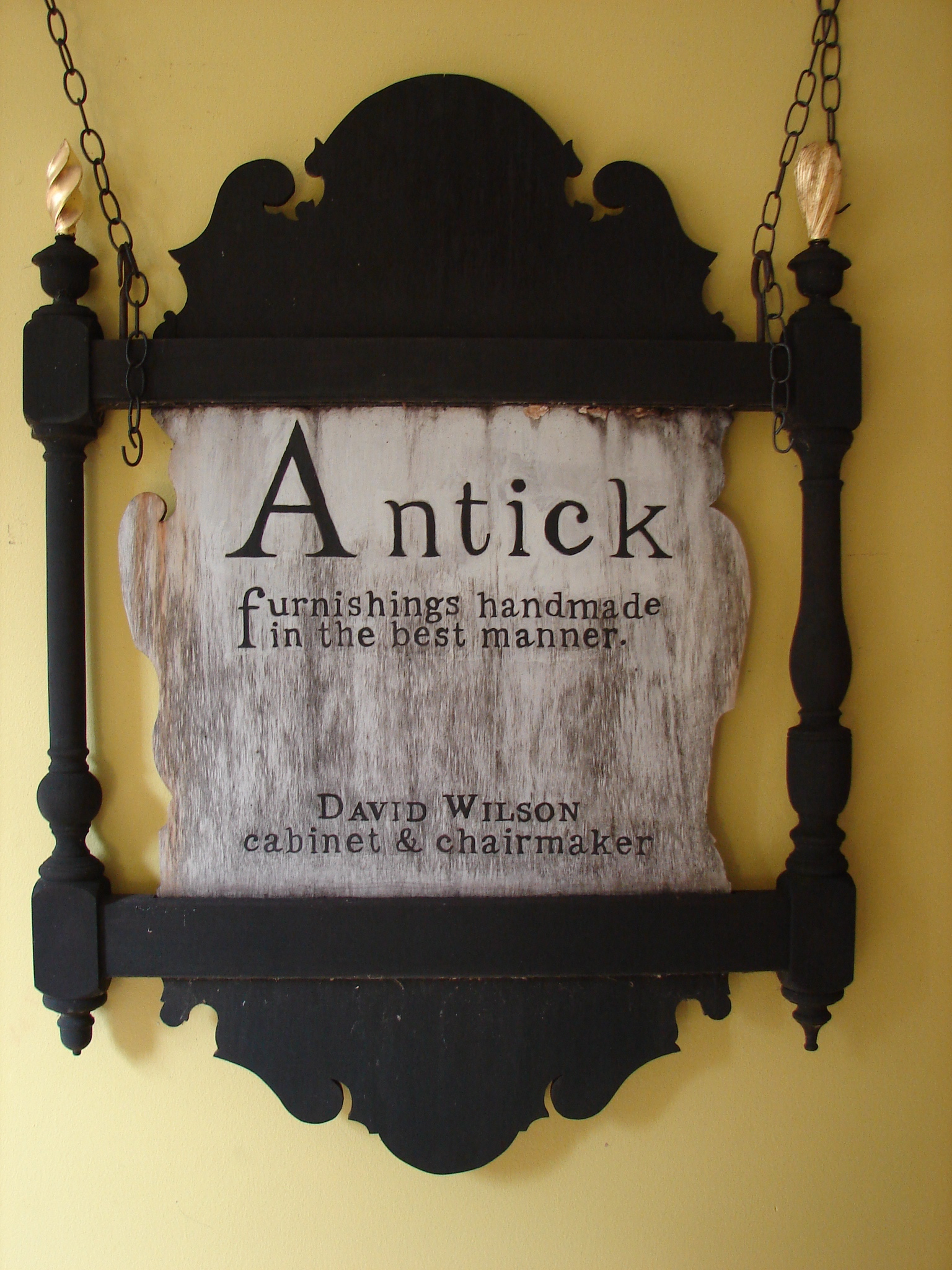 The first sign I made for the store was made of maple and basswood. It has a typical trade sign construction consisting of a frame with a board let into a slot cut into the top and bottom rail. The board is shaped at the top and bottom like a Chippendale looking glass frame. The sides have two different Queen Anne chair splat patterns cut out. The posts on either side are turned with different forms taken from William & Mary table legs as well as the drops at the bottoms. They are topped with flames in the styles of Philadelphia and Boston. I painted it with milk paint, a bad choice for something that lives outside.