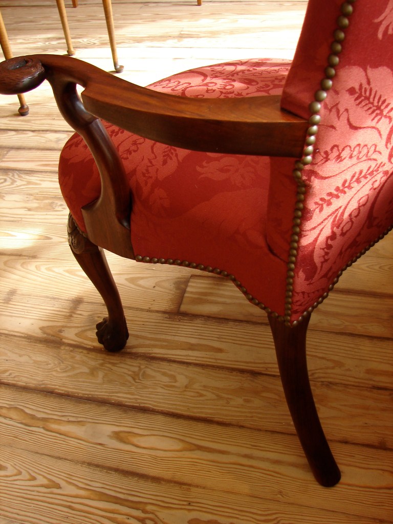 So this chair is a “what if”, that is , what if Hardcastle made one of these earlier chairs with the more Rococo carving. That seemed like a fun idea to me so I made it. The chair is made of Black Walnut and has bird head armrests, carved knees with c scrolls, vines and hairy paw feet. My Dad, a retired Teamster, was not the kind of guy to go looking for a Rococo chair but I think he liked it. He never got to sit in the finished chair though, because I was too fussy about the upholstery.