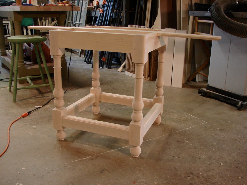 Some folks don’t like the gate-leg because they feel like they will hit their knees, so this table was made without the folding top and legs. It is made of maple that was painted with milk paint on the base and stained on the top. It is 60 inches wide, a good size for 6 people.