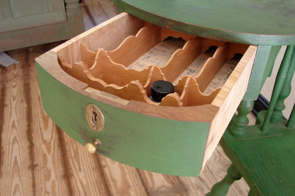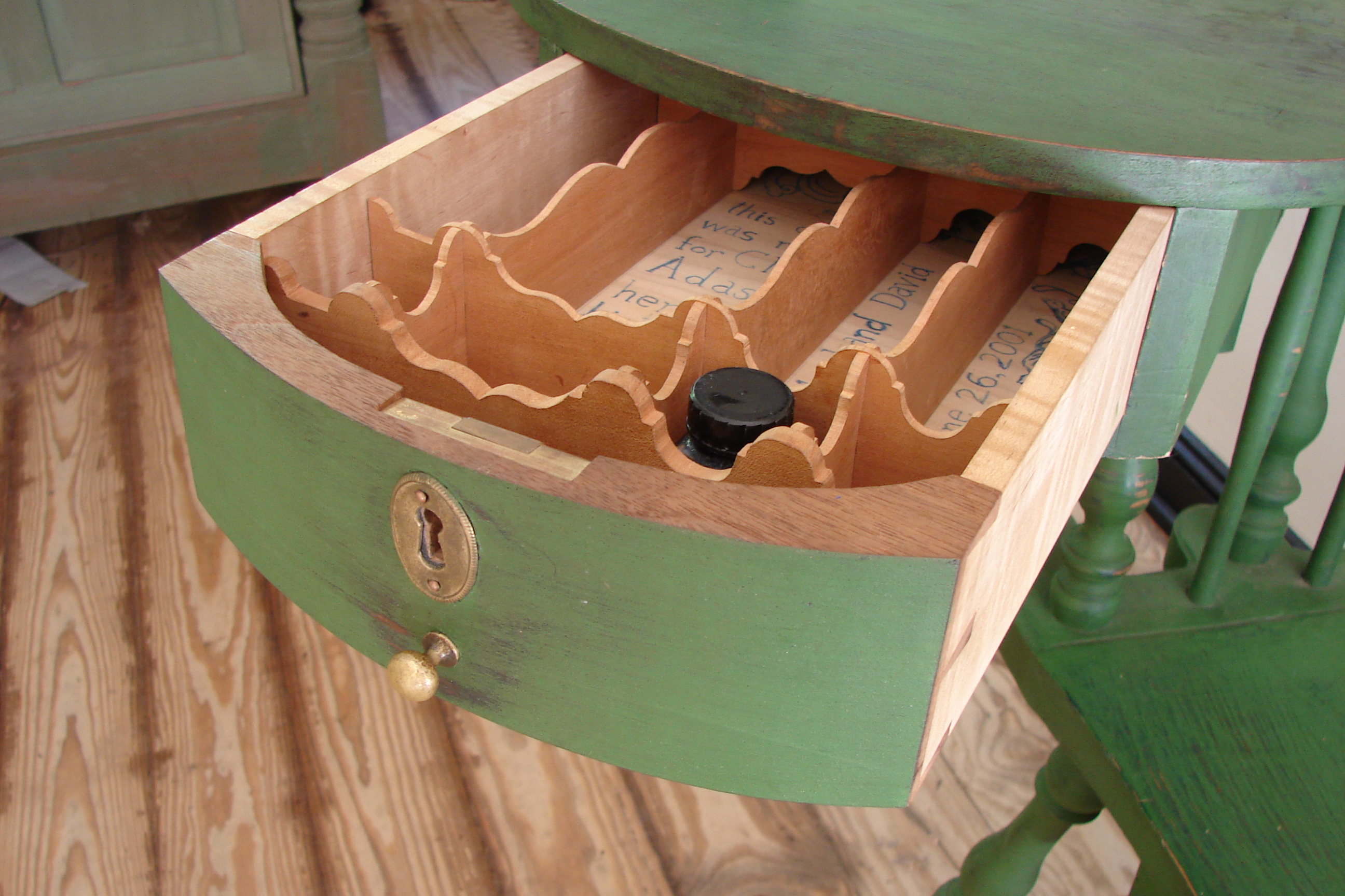 Inside the box is a till with its own lid, which can be used to prop the top open. There is also a secret compartment. This box belongs to my oldest son, Malcolm, and is pretty much filled up already. I tried make the boxes unique while keeping the design identical. The difference is all in the finish. Isaac’s is painted green over red milk paint with a coat of shellac, and Malcolm’s is red with most of the paint sanded off and a coat of linseed oil. Both boxes are made of sassafras, a local hardwood that is light, aromatic and closely resembles chestnut.