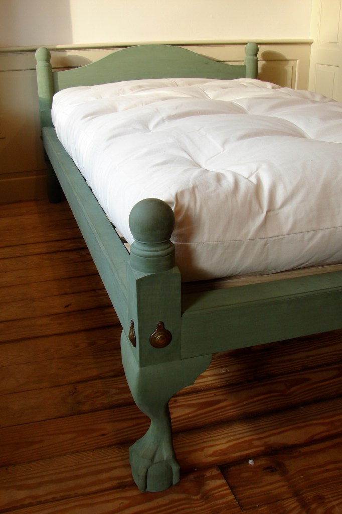 This is a twin size, low post, ball & claw foot bed, based on a bed from Philadelphia circa 1750-1760. It is made of maple with ash slats. The legs are cut from boards four inches thick. The legs are then turned on the lathe to make the ball on top of the post. It’s something to see. The ankle of the leg seems to disappear as it spins.