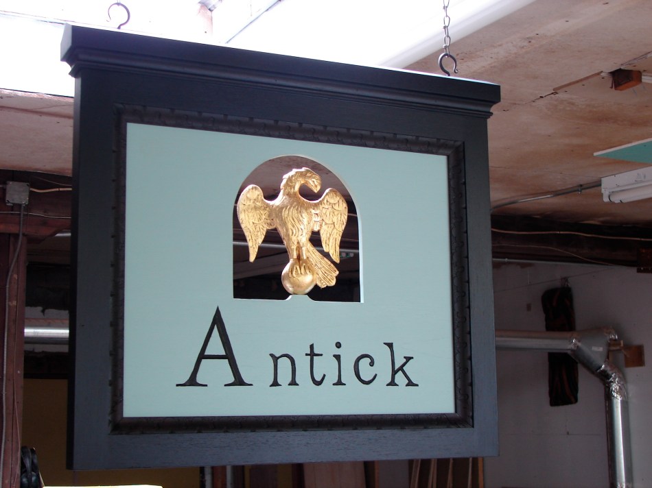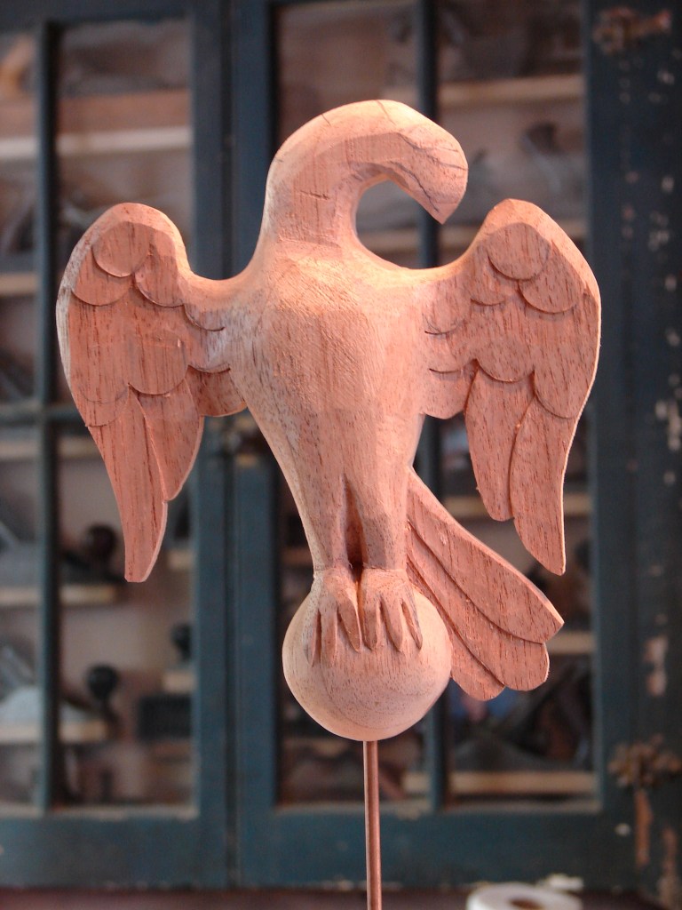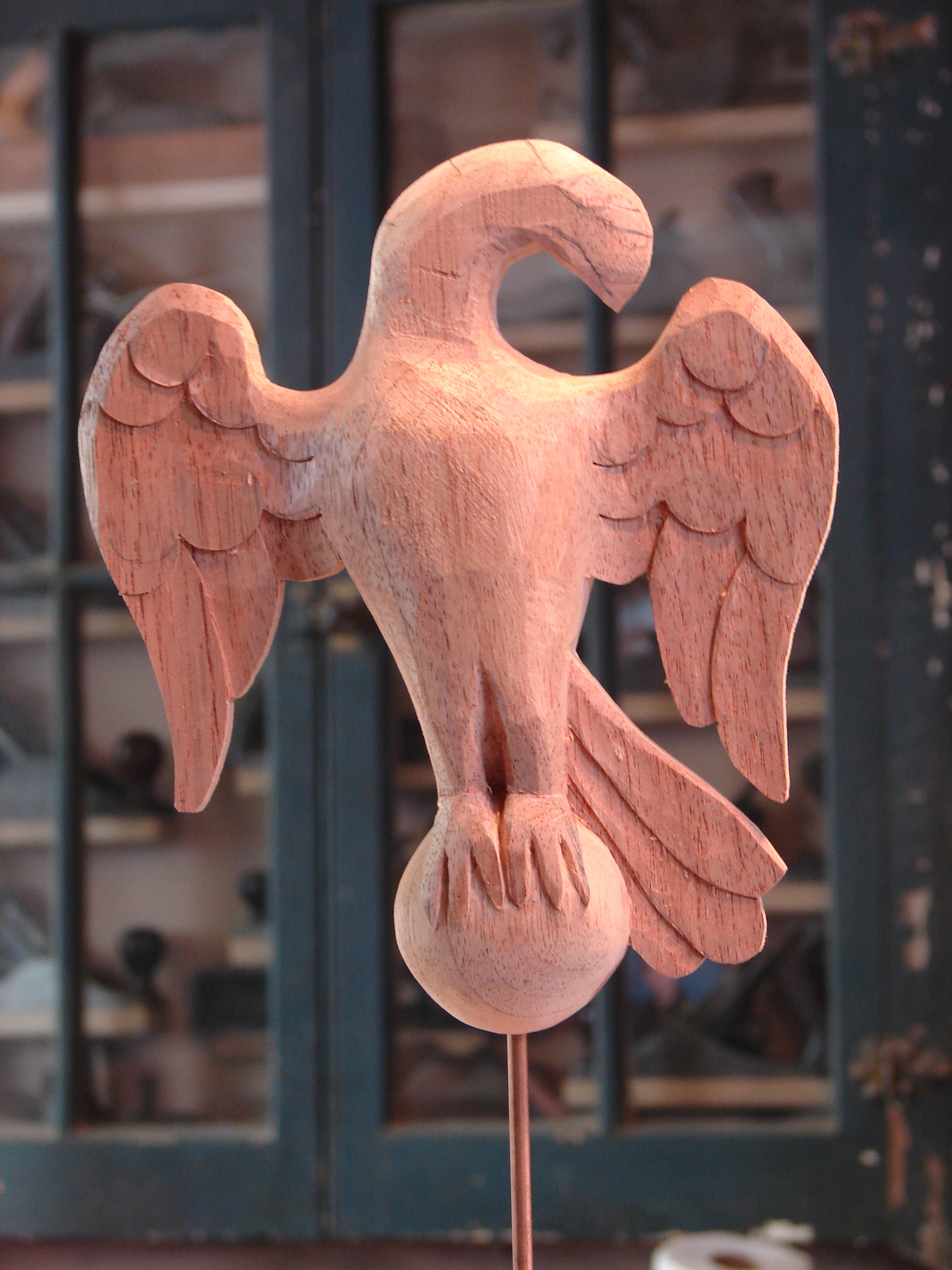 I was looking at some finial carvings from a Boston carver and was inspired to make a new sign. This one had a more eagle like beak but a wonderful long neck and tail feathers.