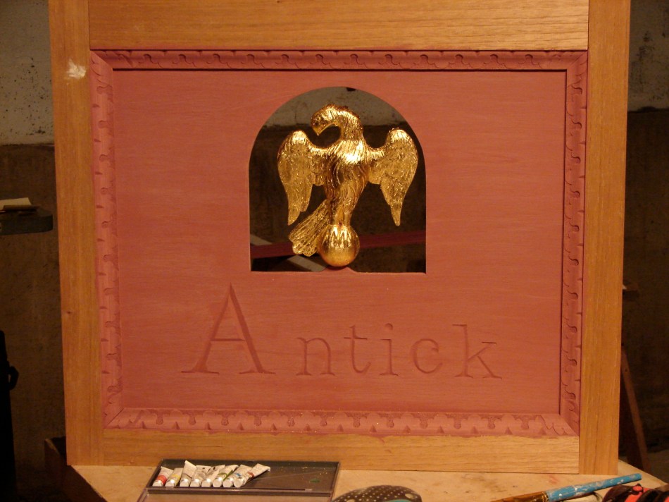 I carved the moulding around the frame with a water leaf pattern and gilded the Phoenix bird with gold leaf.