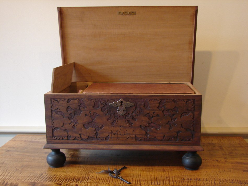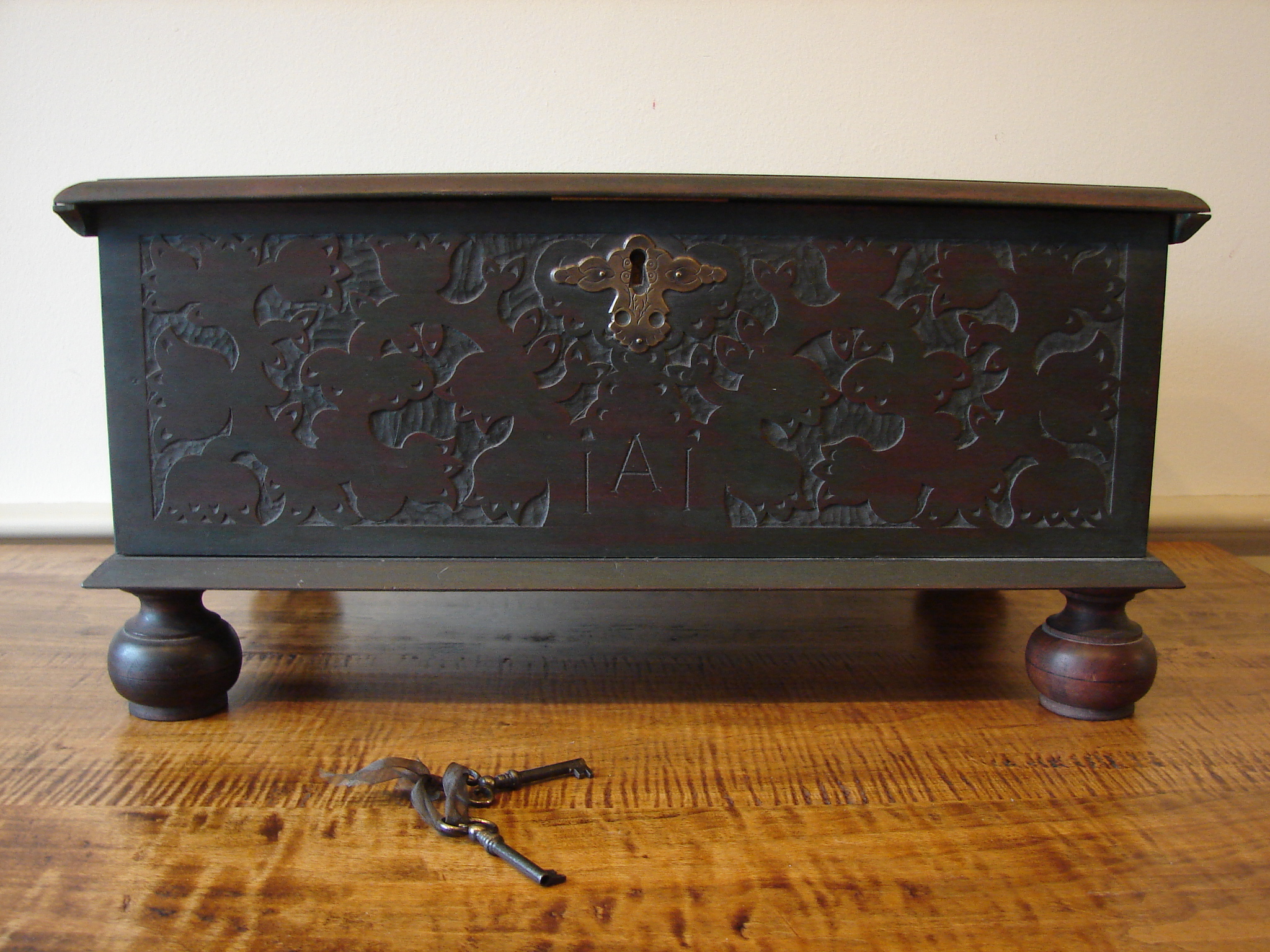 The next piece is a desk box I designed based on the Mannerist carved Hadley chest tradition of the Connecticut River Valley. Interestingly the Valuables Cabinet above could have been made by John Pease who later moved to the Hadley area and may have helped to start that school of carved furniture.
