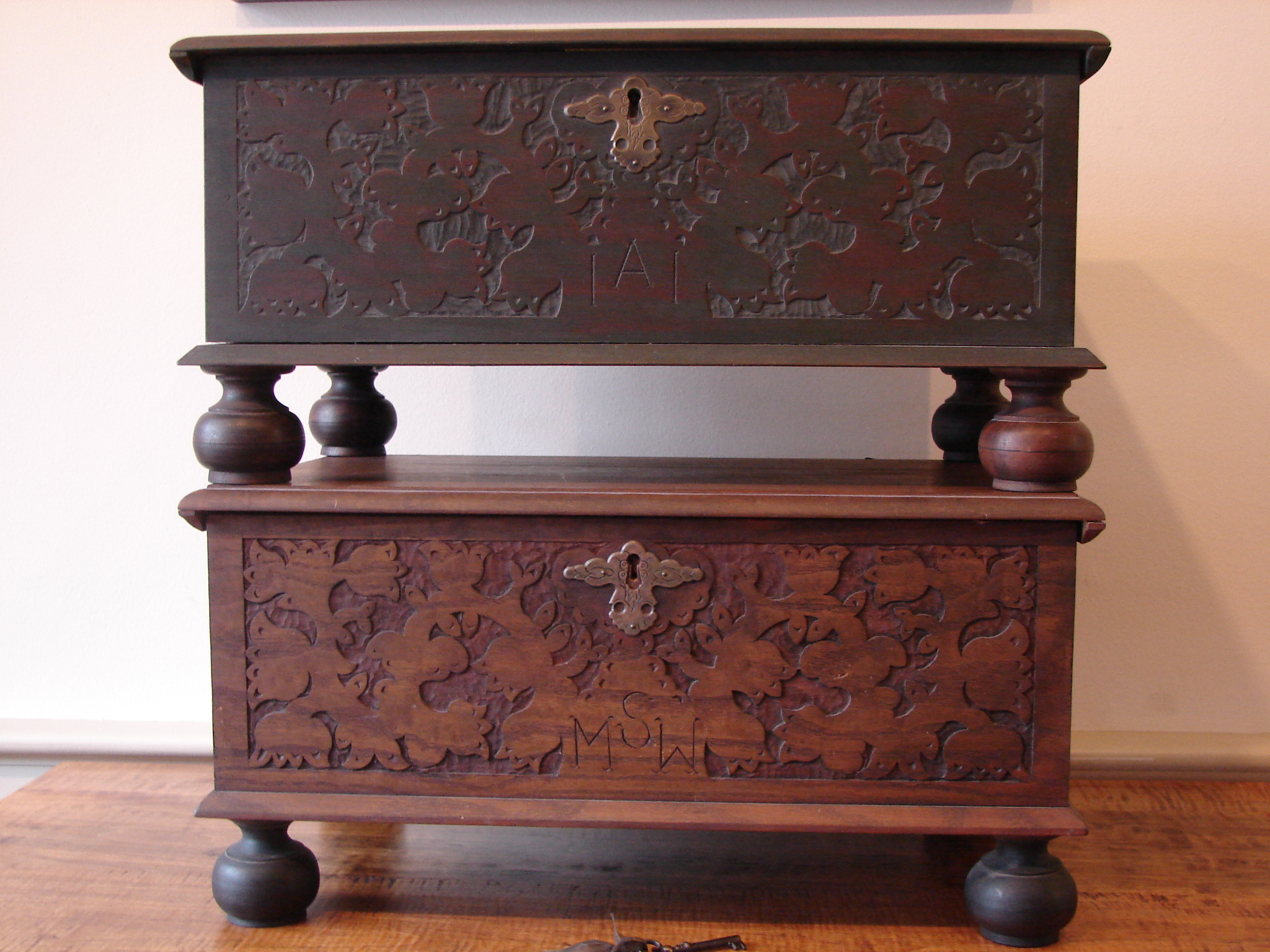 This is a joined chest that would have been made in the Connecticut River Valley near Hadley Massachusetts from 1680 to 1730. It origins go back much further, it’s medieval really, The designs decorating this chest are said to derive from pagan fertility symbols.