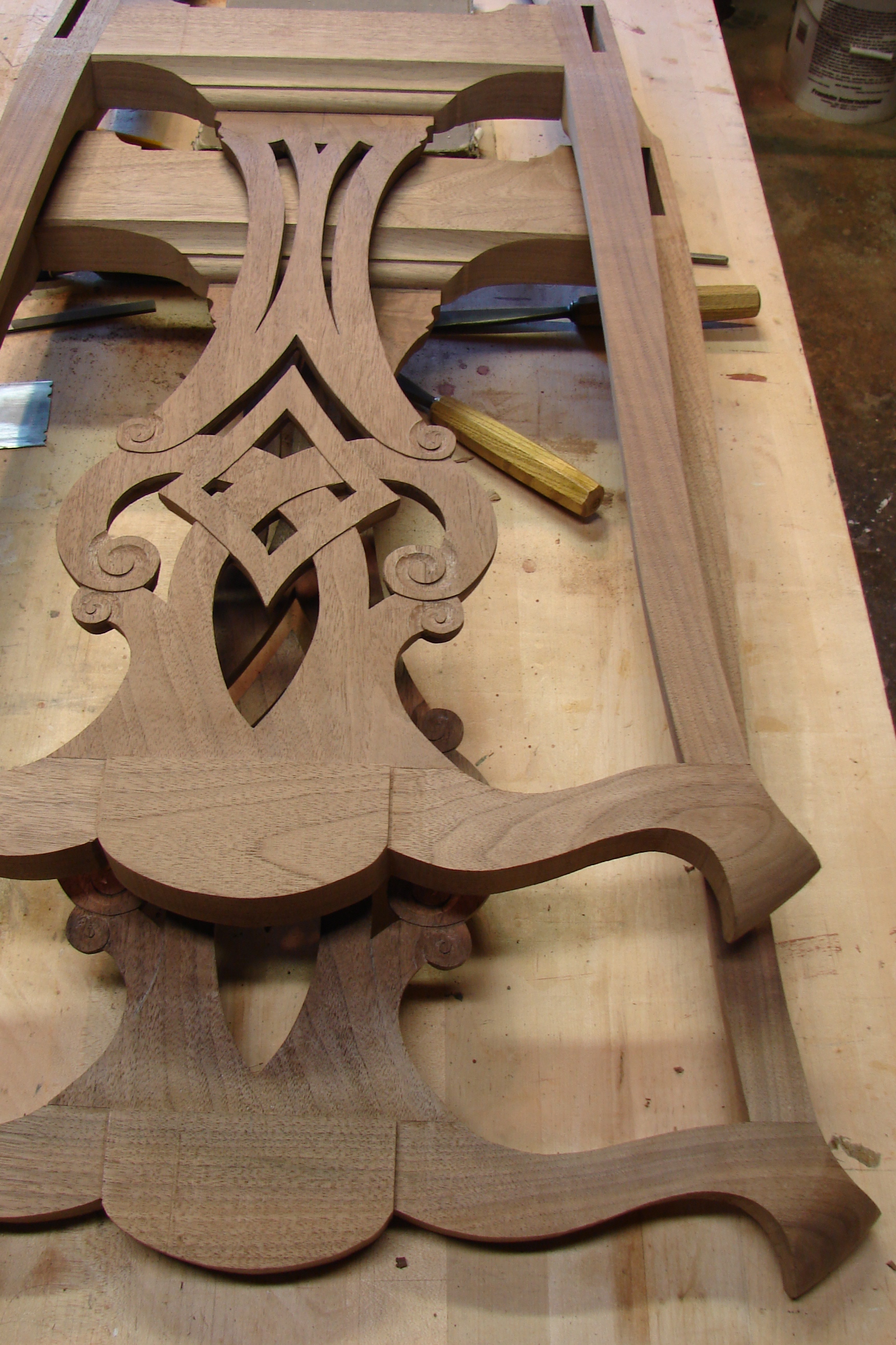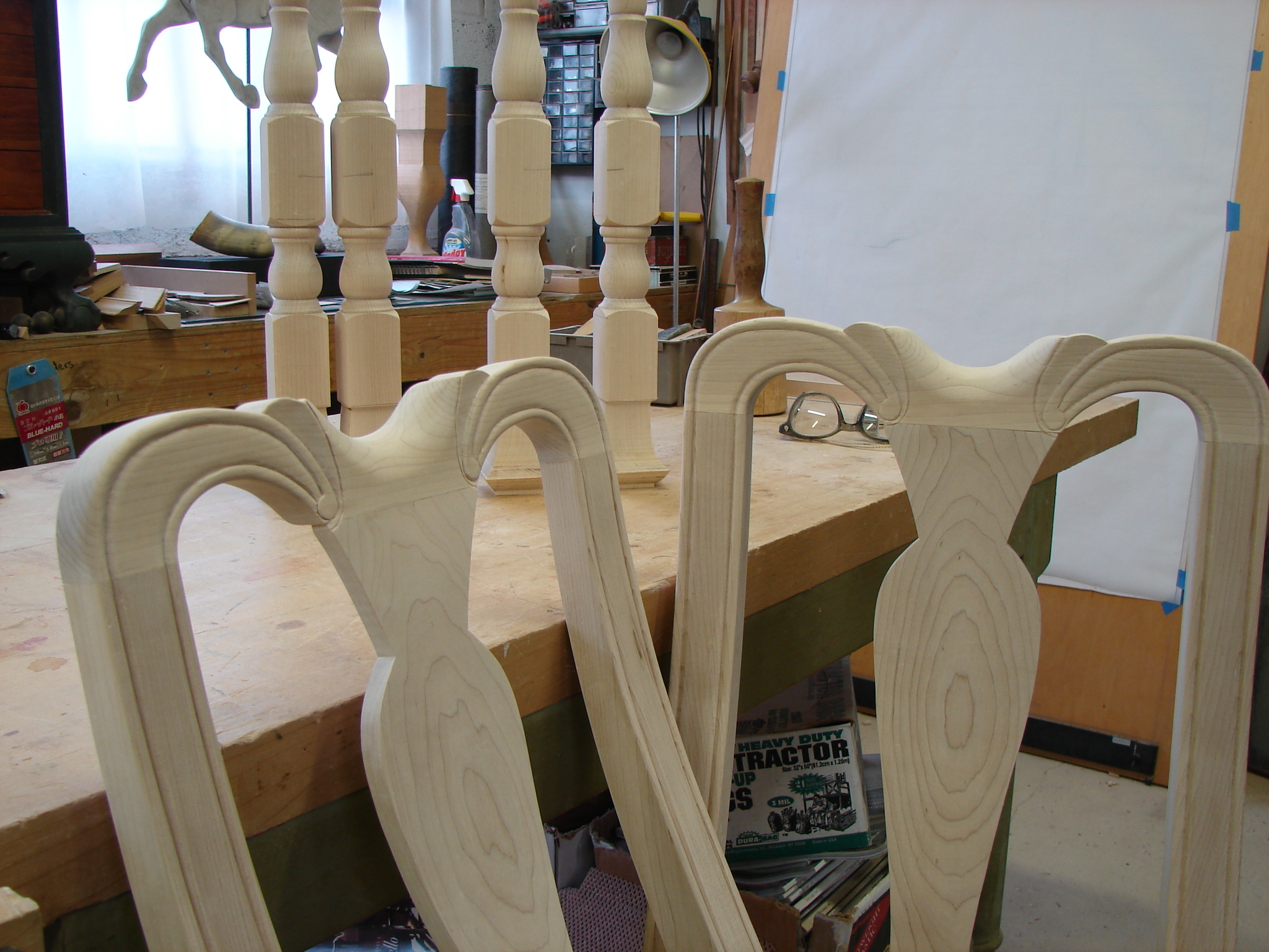 Then there is a point where the parts start to take shape. The goal is to make each part like it was made of the same piece of wood. The grain should do the same thing in the same place on every leg, post or crest rail. It’s hard to do. You have to be sure the growth rings are facing the same way when cutting out the shapes. Things start to happen quickly at this stage.